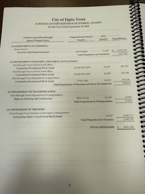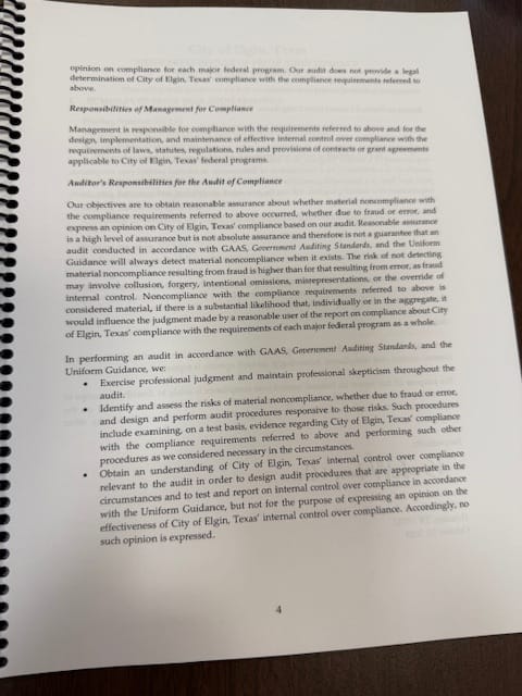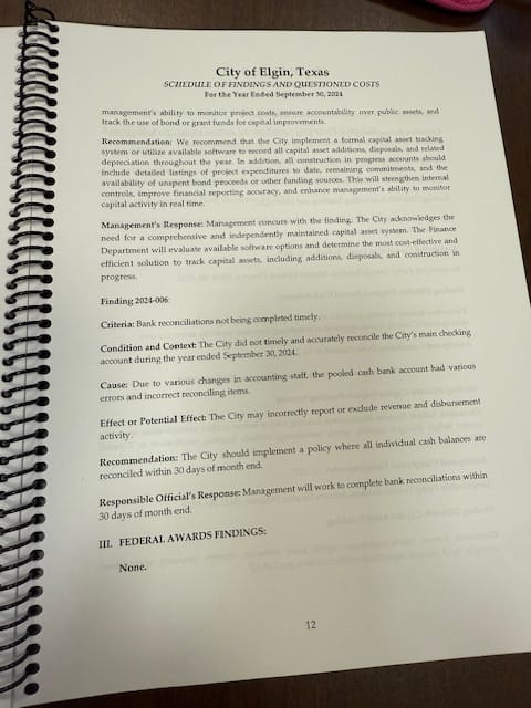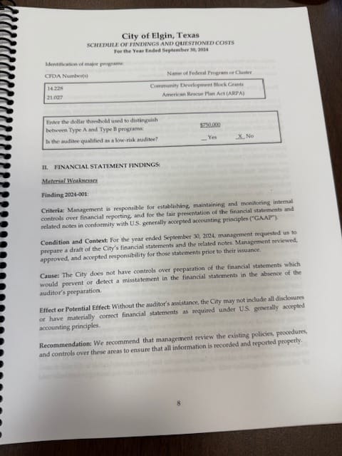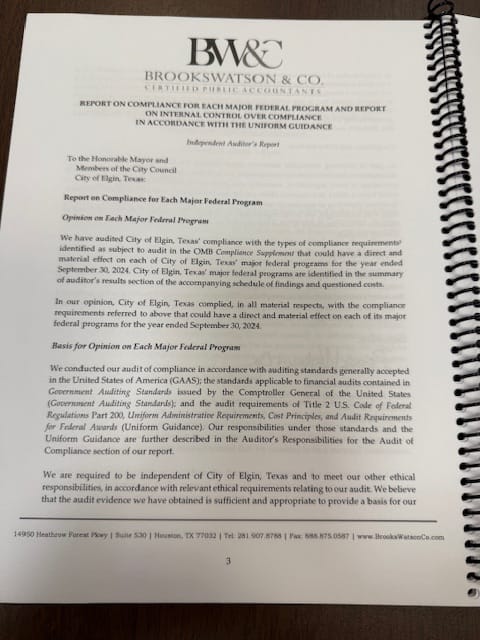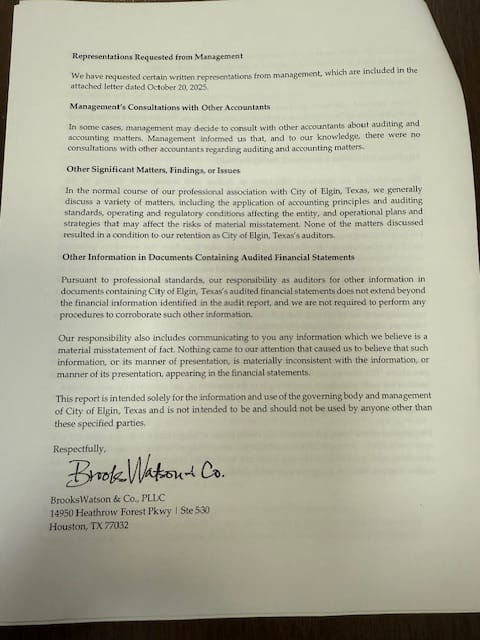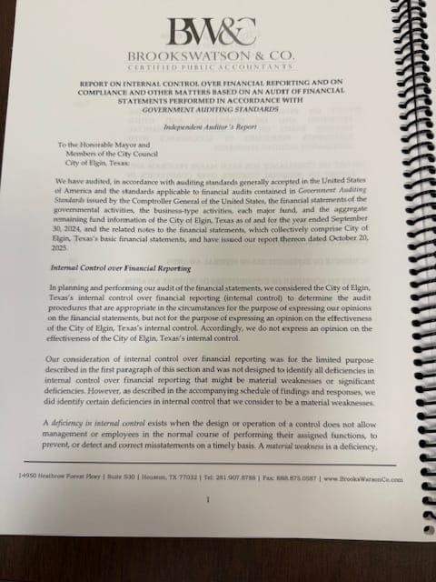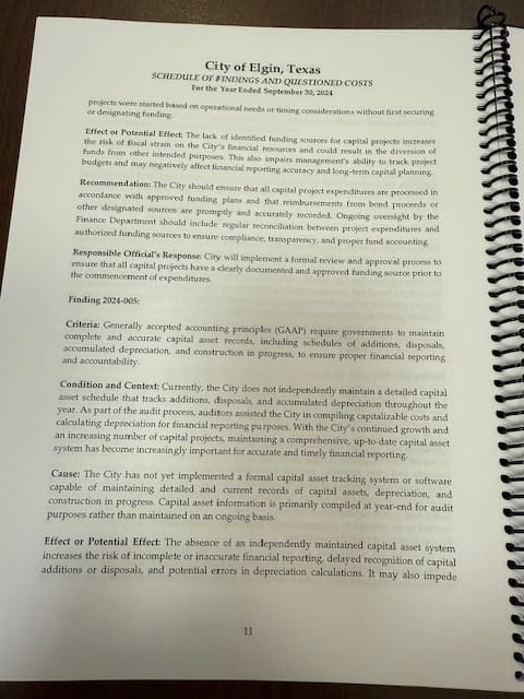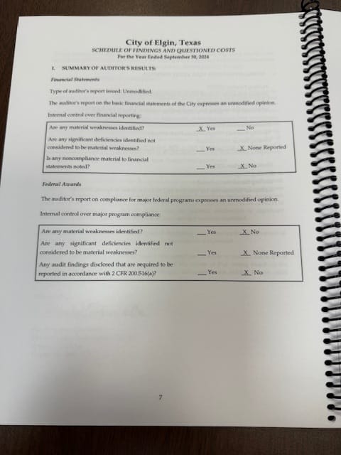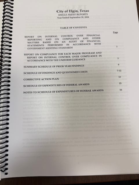 While the audits are online, the City of Elgin was given a supplementary single audit report with their annual financial audit for the year ending Sept. 30, 2024. This report, dated Oct. 20, 2025, was not made available online with the financial audit, but is available at Elgin City Hall by requesting to view the audit. Smithville Texas News viewed that record on Tuesday and we have included photographed pages of that report at the end of this article so the public can access it online.