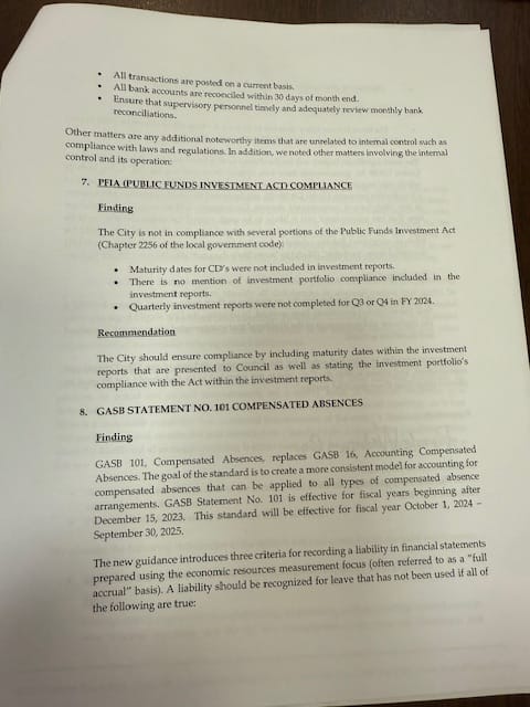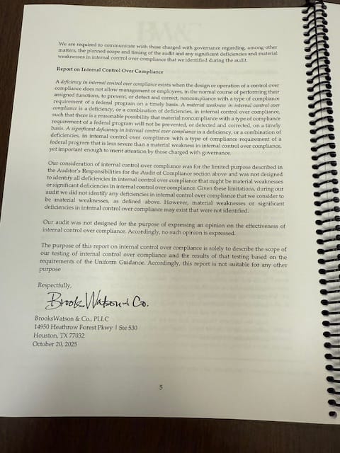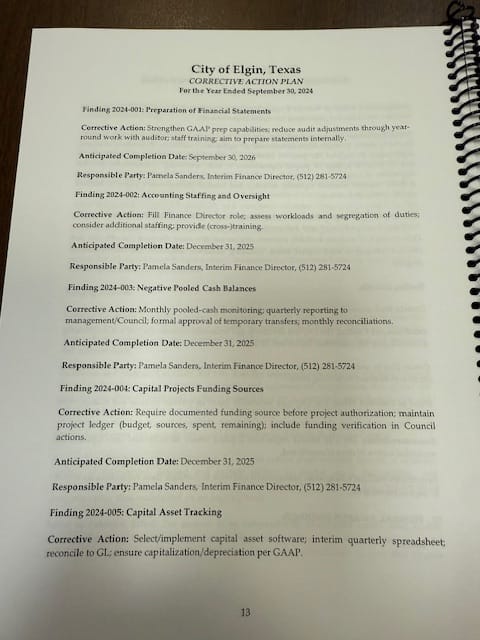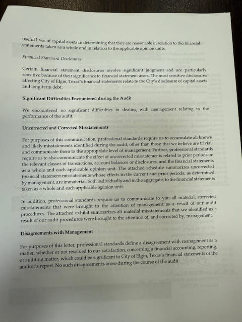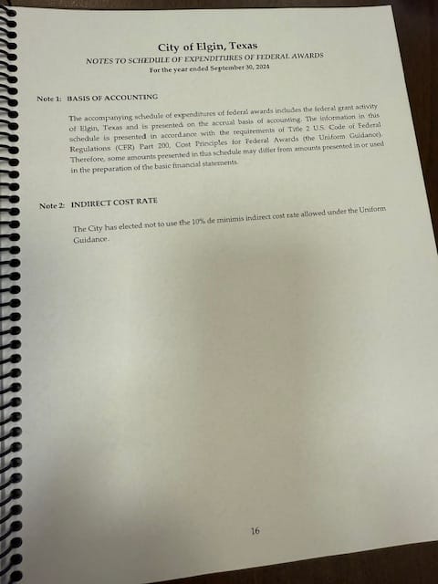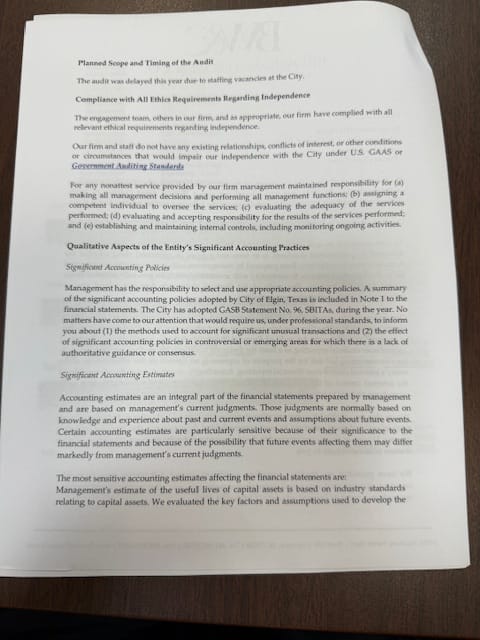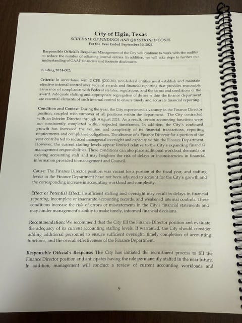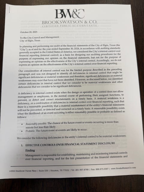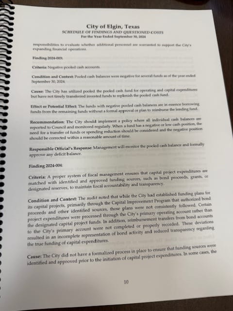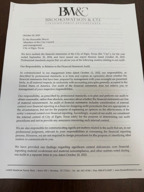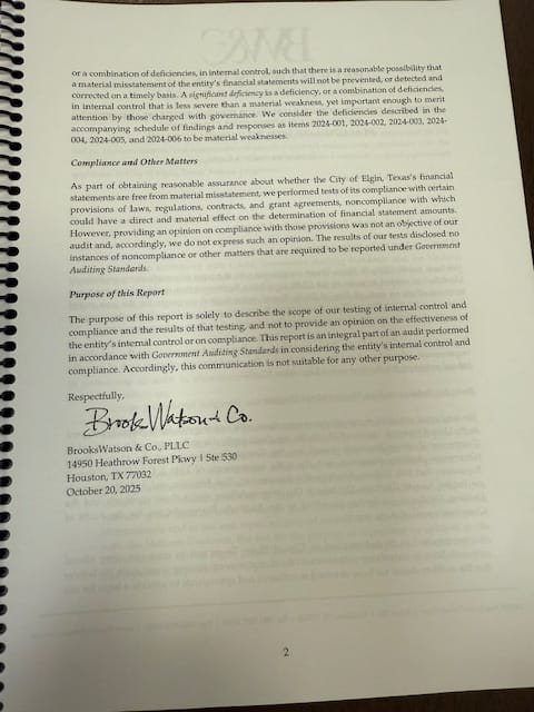 While the audits are online, the City of Elgin was given a supplementary single audit report with their annual financial audit for the year ending Sept. 30, 2024. This report, dated Oct. 20, 2025, was not made available online with the financial audit, but is available at Elgin City Hall by requesting to view the audit. Smithville Texas News viewed that record on Tuesday and we have included photographed pages of that report at the end of this article so the public can access it online.