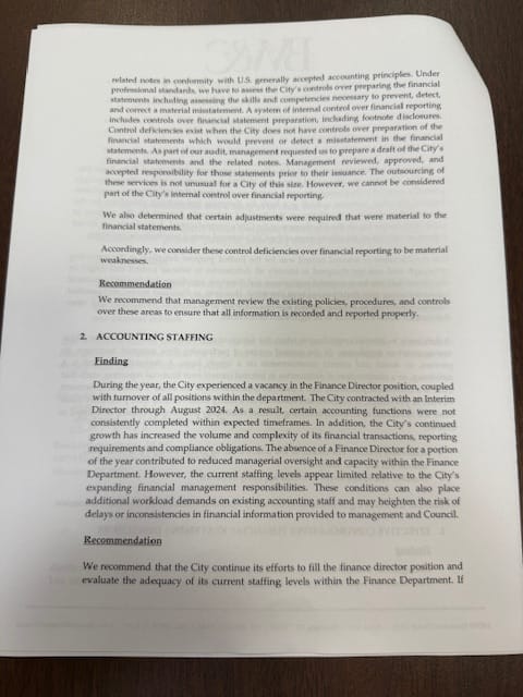 The auditor’s letter also said the city’s growth has increased both the volume and complexity of the financial transactions, noting the current staffing levels “appear limited relative to the city’s expanding financial management responsibilities.”