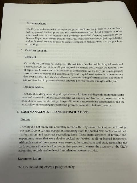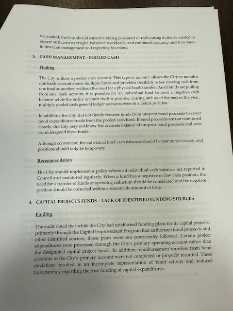 Additionally, the letter noted reimbursement transfers from bond accounts to the city’s primary account were not completed or recorded correctly. “These deviations resulted in an incomplete representation of bond activity and reduced transparency regarding the true funding of capital expenditures,” the letter said.
