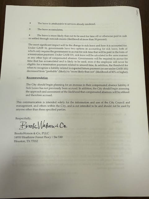 Auditor's Recommendation: “The City should begin planning for an increase in their compensated absence liability if Sick Leave has not previously been accrued. In addition, the City should begin assessing the approach and assessment of the likelihood that compensated absences will be utilized and therefore accrued.”
