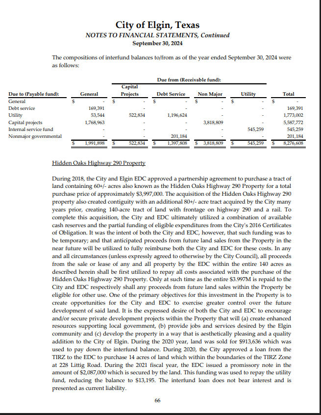 But page 66 of the financial audit provides financial statements and a narrative for the Hidden Oaks Highway 290 Property project. The auditors noted how many times money was loaned between the City of Elgin, Elgin’s Economic Development Corporation, and Elgin’s TIRZ.