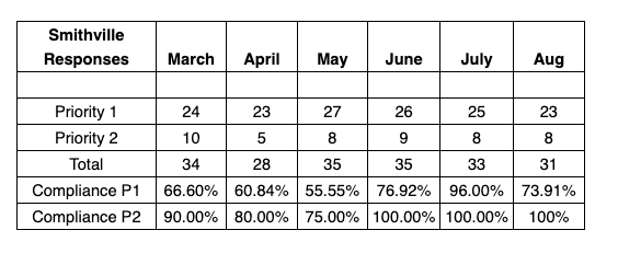 In June, the first month with the additional ambulances, response times in Smithville for a priority one call (highest urgency) increased from 55% to as high as 96%. Priority two calls have been 100% compliant.