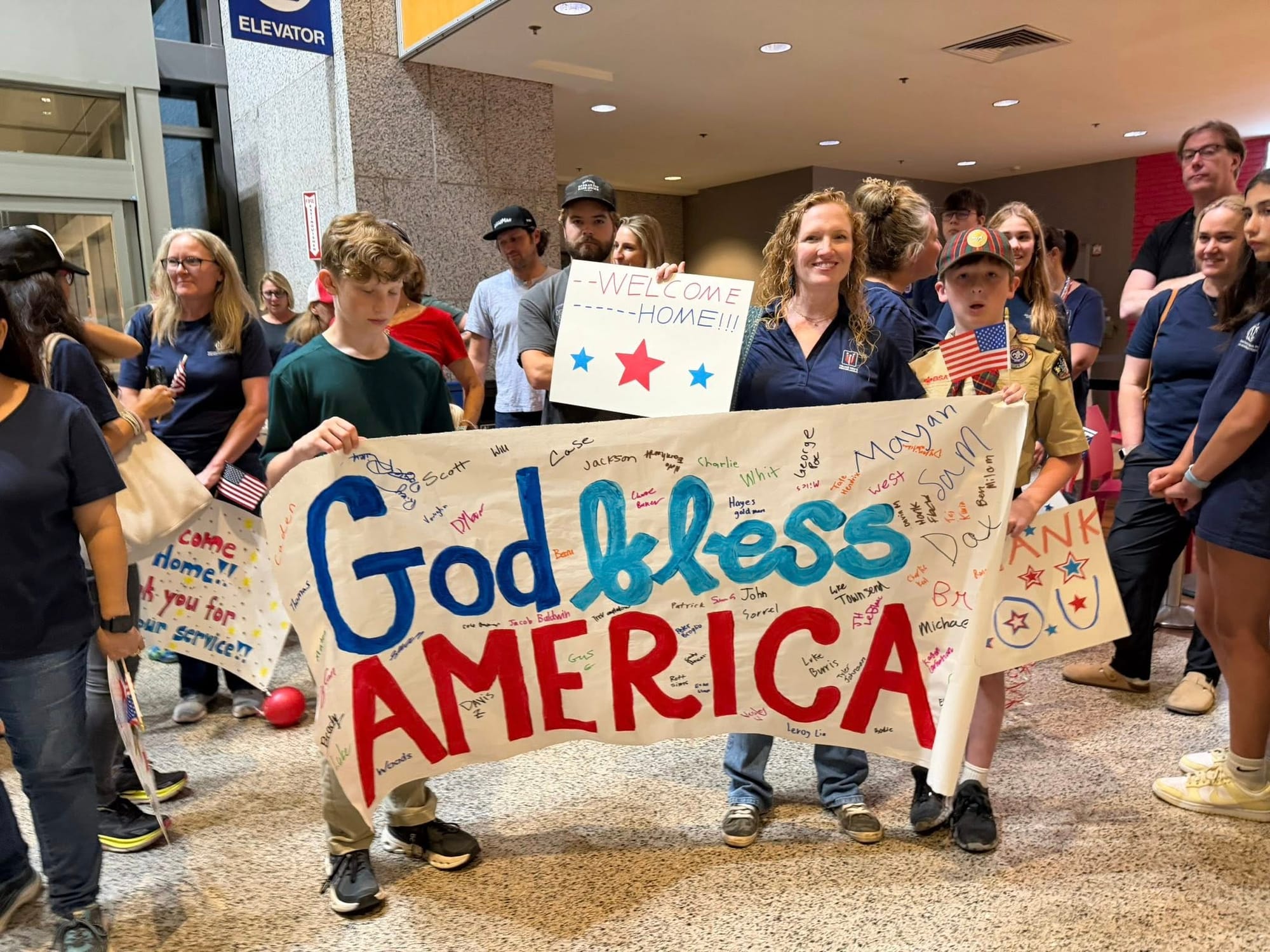 Friends, family and strangers who just happened to be at the Austin-Bergstrom on a rainy Saturday night lined the corridor, cheering and waving flags. Rooks’ wife broke through the crowd for a long embrace.