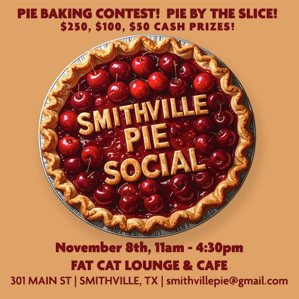 11-4pm: Fat Cat Cafe: Smithville Pie Social: Pie Baking Contest with a CASH PRIZE of $250! Pies will be sold by the slice, along with tea and coffee. All proceeds benefit the Smithville Farmers Market.